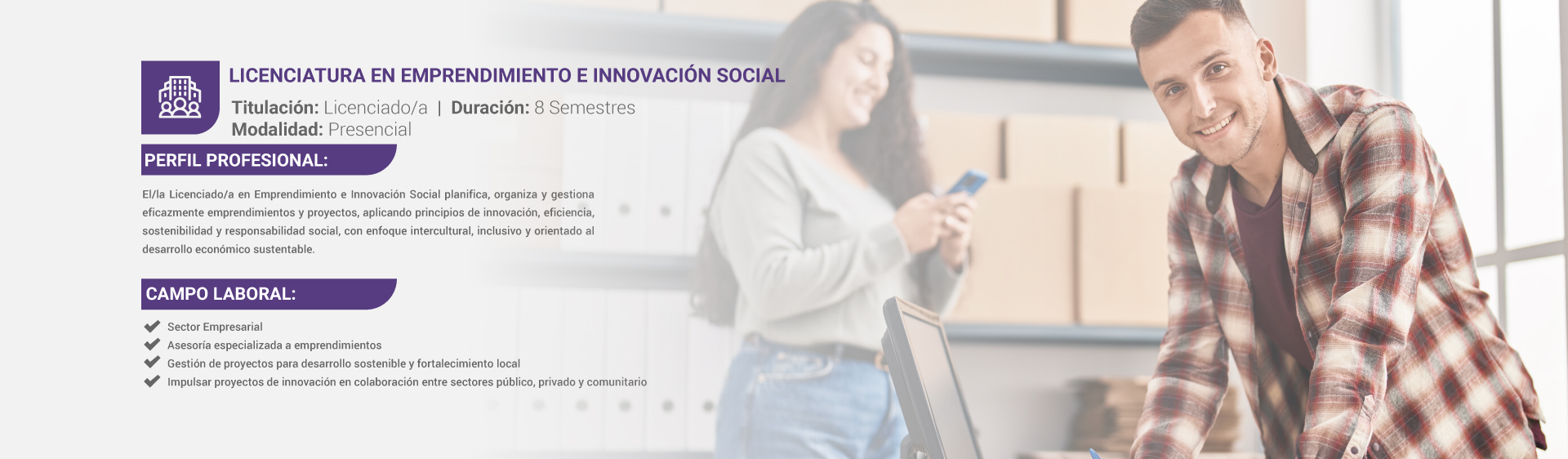 | PERFIL PROFESIONAL: | El/la Licenciado/a en Emprendimiento e Innovación Social es un/a profesional capaz de implementar una gestión administrativa y estratégica eficiente del emprendimiento bajo altos estándares de calidad, que priorizan la innovación y las buenas prácticas, esto posibilita la creación, mejora continua, optimización y crecimiento de los emprendimientos; por ende, el desarrollo económico sostenible y sustentable de la sociedad con respeto a la diversidad, interculturalidad e inclusión |