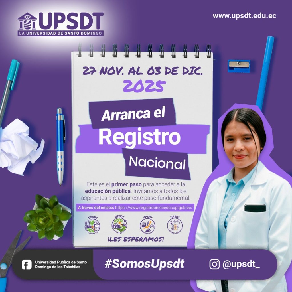 Del 𝟮𝟳 𝗱𝗲 𝗻𝗼𝘃𝗶𝗲𝗺𝗯𝗿𝗲 𝗮𝗹 𝟬𝟯 𝗱𝗲 𝗱𝗶𝗰𝗶𝗲𝗺𝗯𝗿𝗲 se apertura el 𝗥𝗲𝗴𝗶𝘀𝘁𝗿𝗼 𝗡𝗮𝗰𝗶𝗼𝗻𝗮𝗹, el primer paso para acceder a la educación pública.Invitamos a todos los aspirantes a la Universidad Pública de Santo Domingo de los Tsáchilas a inscribirse y avanzar hacia su futuro profesional.